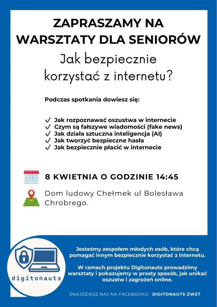 Celem naszego projektu jest zwiększanie świadomości cyfrowej oraz edukacja w zakresie cyberbezpieczeństwa i higieny cyfrowej wśród seniorów oraz młodzieży – grup szczególnie narażonych na zagrożenia internetowe i oszustwa online.
